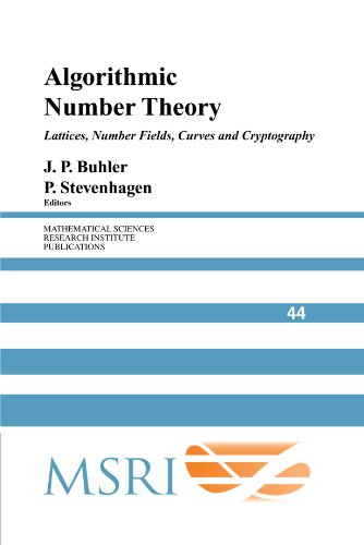 Solving the Pell equation / Hendrik W. Lenstra, Jr. Basic algorithms in number theory / Stan Wagon Smooth numbers and the quadratic sieve / Carl Pomerance The number field sieve / Peter Stevenhagen Four primality testing algorithms / Rene Schoof Lattices / Hendrik W. Lenstra, Jr. Elliptic curves / Bjorn Poonen The arithmetic of number rings / Peter Stevenhagen Smooth numbers: computational number theory and beyond / Andrew Granville Fast multiplication and its applications / Daniel J. Bernstein Elementary thoughts on discrete logarithms / Carl Pomerance The impact of the number field sieve on the discrete logarithm problem in finite fields / Oliver Schirokauer Reducing lattice bases to find small-height values of univariate polynomials / Daniel J. Bernstein Computing Arakelov class groups / Rene Schoof Computational class field theory / Peter Stevenhagen Contents note continued: Protecting communications against forgery / Daniel J. Bernstein Algorithmic theory of zeta functions over finite fields / Daqing Wan Counting points on varieties over finite fields of small characteristic / Daqing Wan Congruent number problems and their variants / Noriko Yui. An introduction to computing modular forms using modular symbols / William A. Stein.
