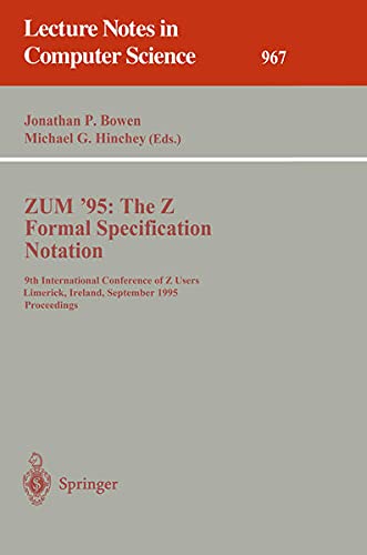 This book presents the proceedings of the 9th International Conference of Z Users, ZUM '95, held in Limerick, Ireland in September 1995. The book contains 34 carefully selected papers on Z, using Z, applications of Z, proof, testing, industrial usage, object orientation, animation of specification, method integration, and teaching formal methods. Of particular interest is the inclusion of an annotated Z bibliography listing 544 entries. While focussing on Z, by far the most commonly used "formal method" both in industry and application, the volume is of high relevance for the whole formal methods community.